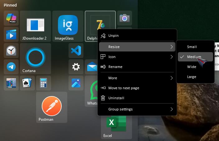 The other one which is set to small controls the size the Windows 10 style menu uses itself for that icon. Small is the smallest unit, Medium is 2x2, etc. This is the same as in the original Windows 10 menu. It allows for icons in a group that take more space than others.